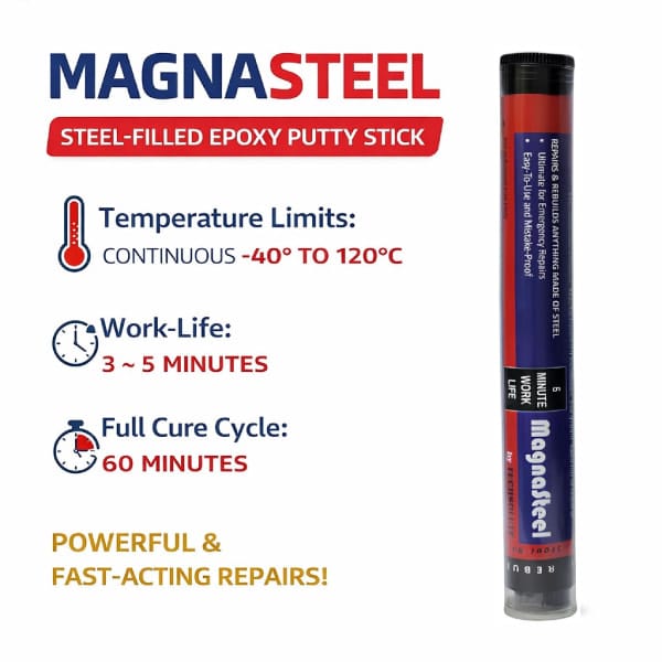 MagnaSteel Epoxy Putty Stick is a fast-setting, industrial-strength polymer compound that enables permanent repairs to anything made of steel or other metals. Each handy stick contains pre-measured portions of activator & base throughout – no measuring or mixing tools are necessary. It is non-rusting and bonds to almost anything except rubber.